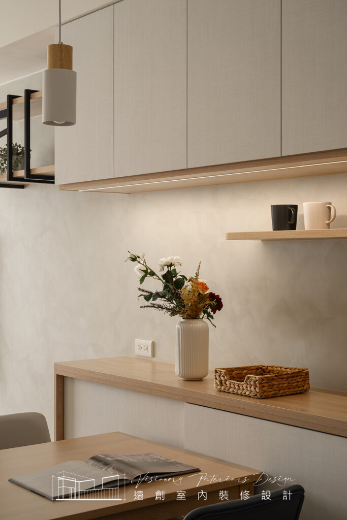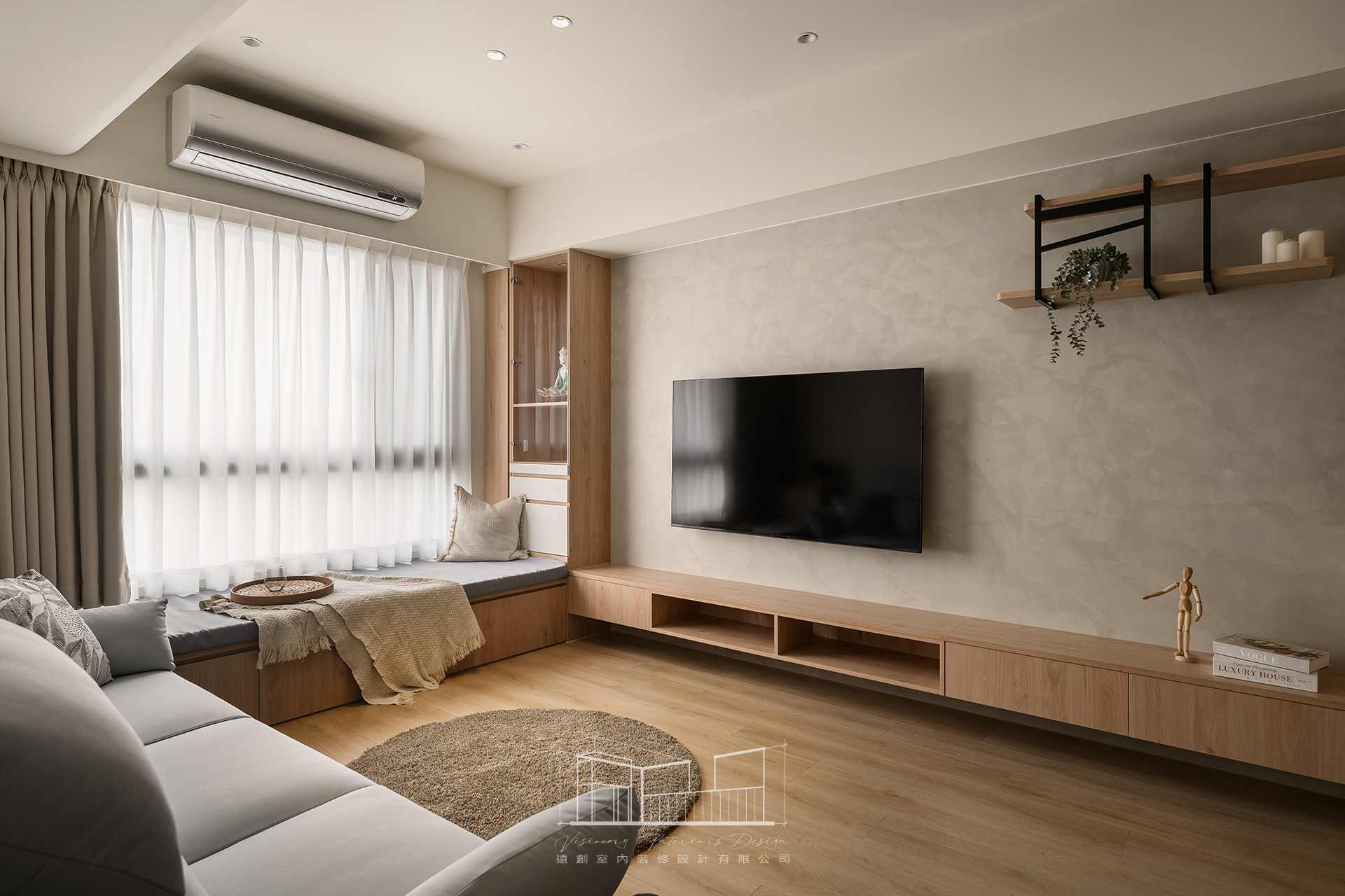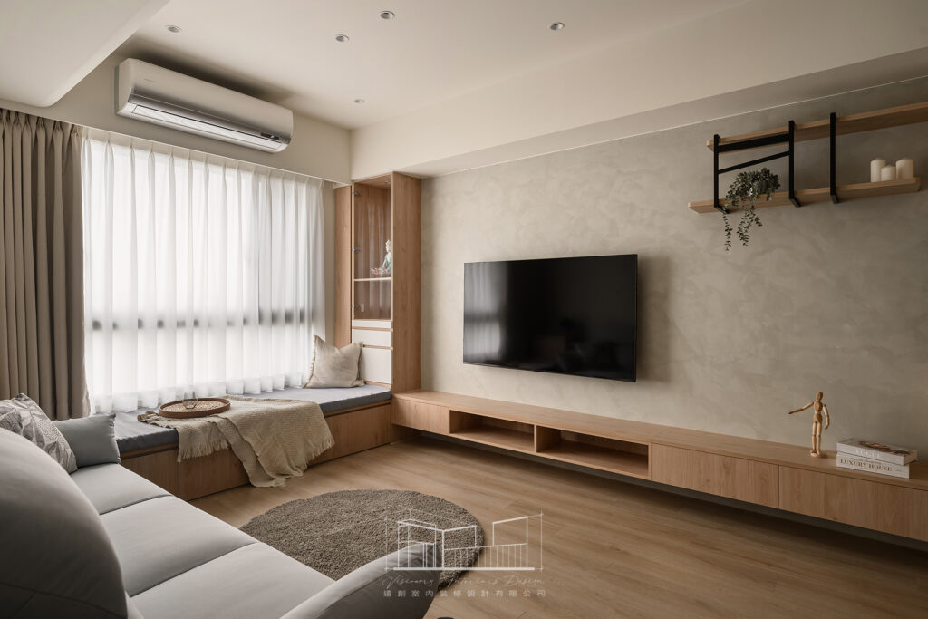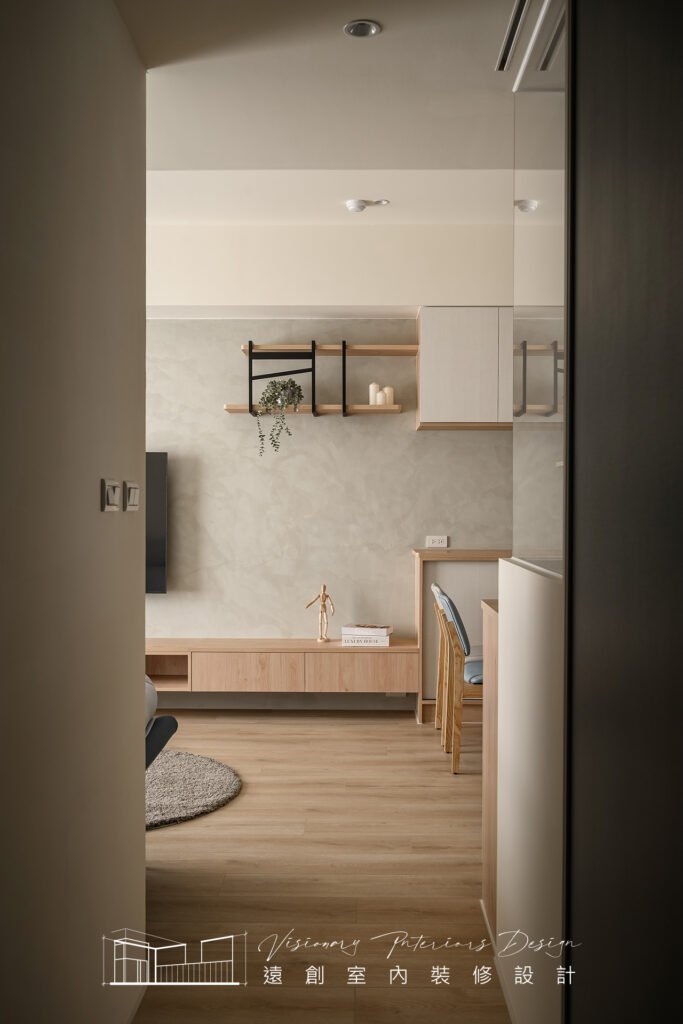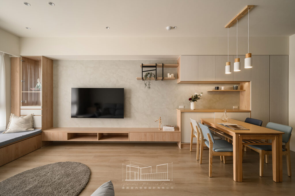 - 質樸基調:客廳電視牆採用流行的微水泥塗料,與全室裝修的淺木色地坪相互映襯,堆疊出侘寂簡約的層次美學。