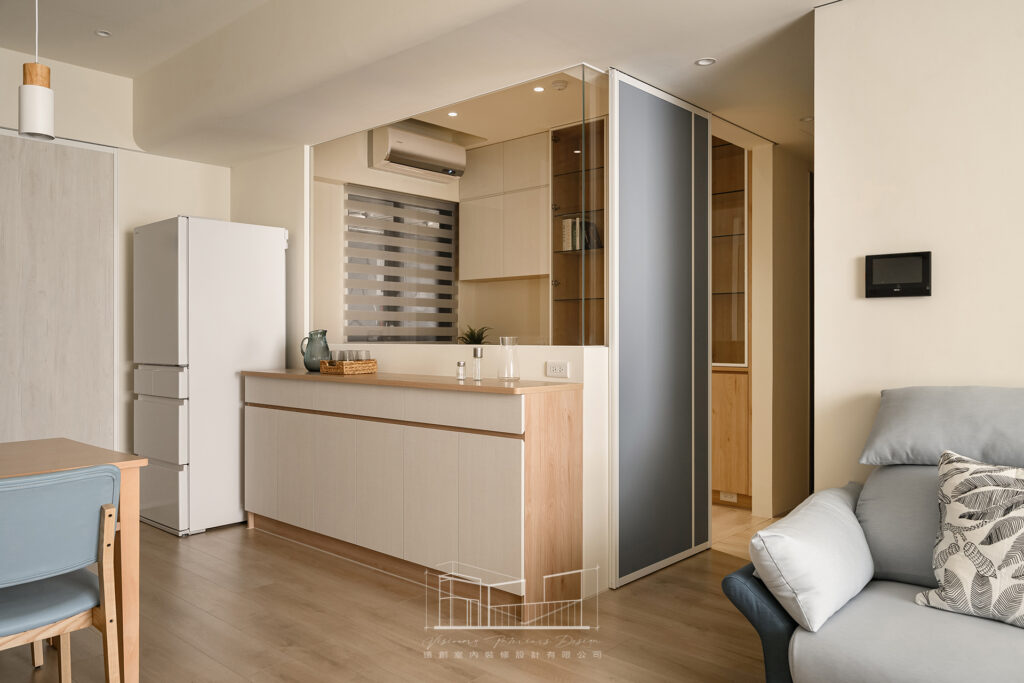 在整體的空間規劃上,採開放式的客餐廳設計,以淺色木紋作為基調,將書房與餐廚區巧妙串聯。透明玻璃的隔間設計,讓光線不再受限,視線所及之處皆是流動的通透感。灰藍色的沙發與餐椅,如同生活中的安靜留白,讓居住者能在此靜心閱讀、或是共度一段午茶時光。