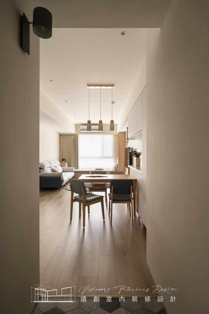 - 機能動線:玄關選用經典六角花磚與客廳地板自然界分,在極簡的視覺下,依然保有清晰的生活機能與落塵區規劃。